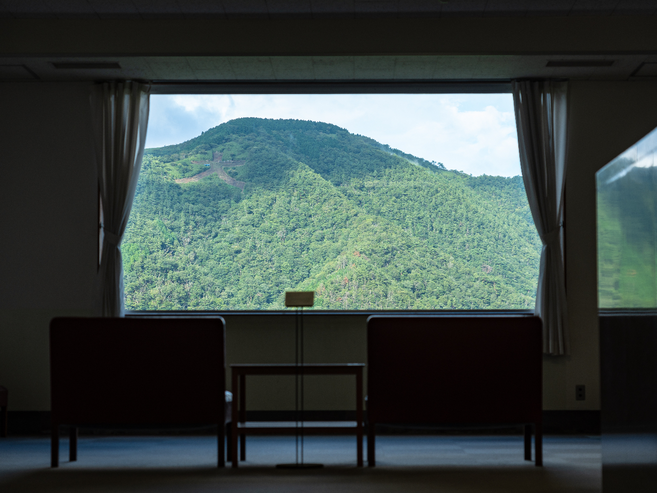 中国風の青瓦を用い、2階ロビーは窓を大きくとり、そこから眺める庭園「神仙郷」と箱根外輪山は季節や時間によって趣を変え、一枚の絵画のようです。