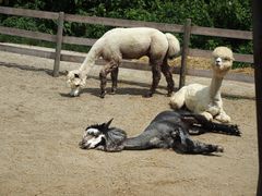 アルパカって可愛いですね。夏は弱いそうで、もこもこの毛は頭を残して刈られています。それがまた可愛い姿でした。寝転がっているのは暑さで倒れたわけではなく虫かなんかでかゆくなった身体を砂でこすっているんですね。とぼけた顔ですましているけど、えさをあげるとにんまりするような・・・。楽しい一時を過ごすことができます。