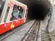 すし詰め状態の ケーブルカーは、ぐいぐい斜面を登っていきます