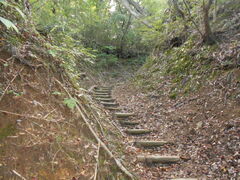 七尾駅前からは地域バス「まりん号」に乗り、城史資料館前で下車。運賃はどこで降りても百円ポッキリ、七尾城史資料館の見学は後にして早速七尾城跡へ向かいます。旧大手道を進み、日本百名城かつ日本五大山城でもある七尾城ですから気合を入れて登城開始。