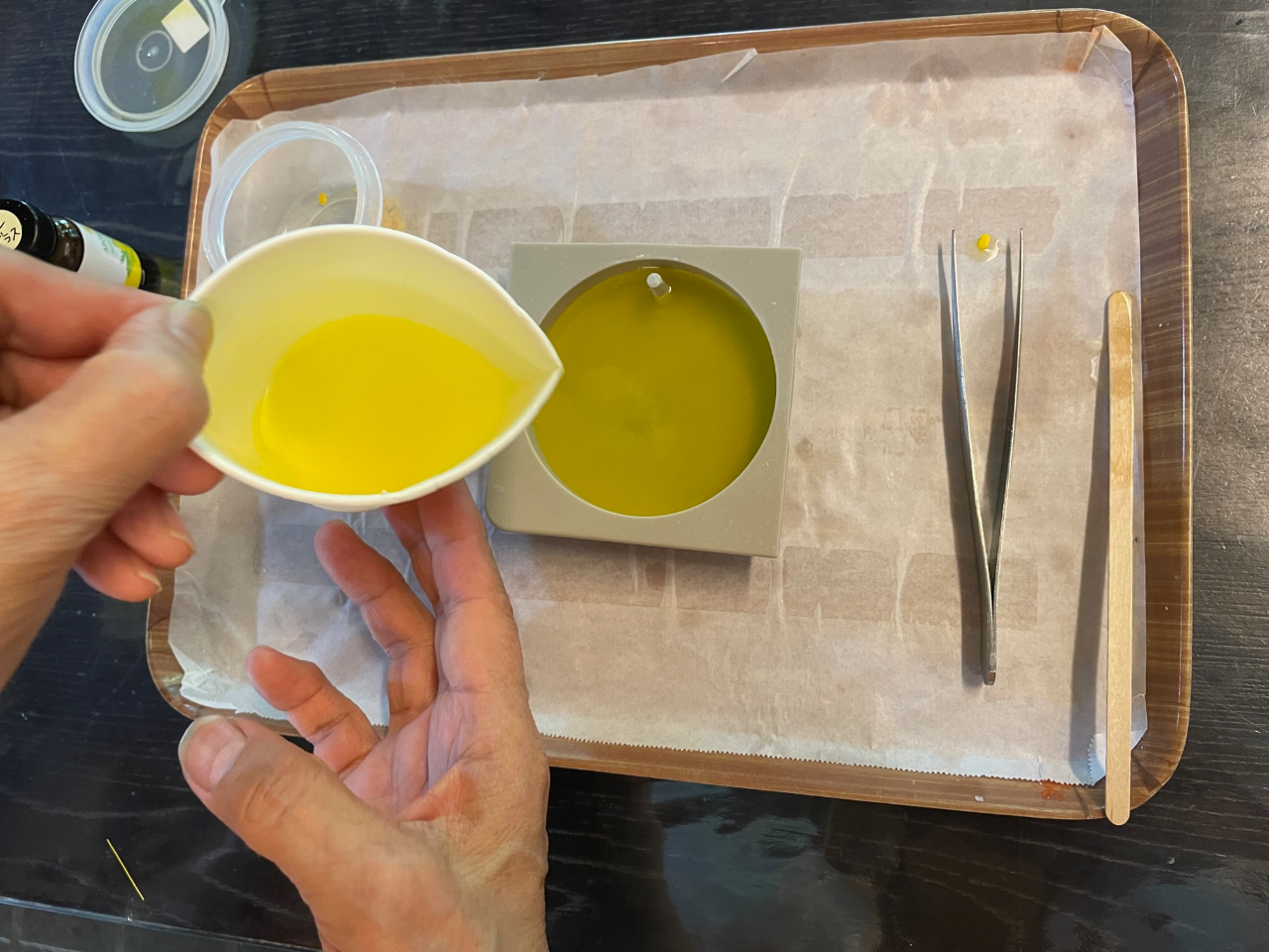 溶けたろうに色と香りをつけ、型枠に流し込みます。