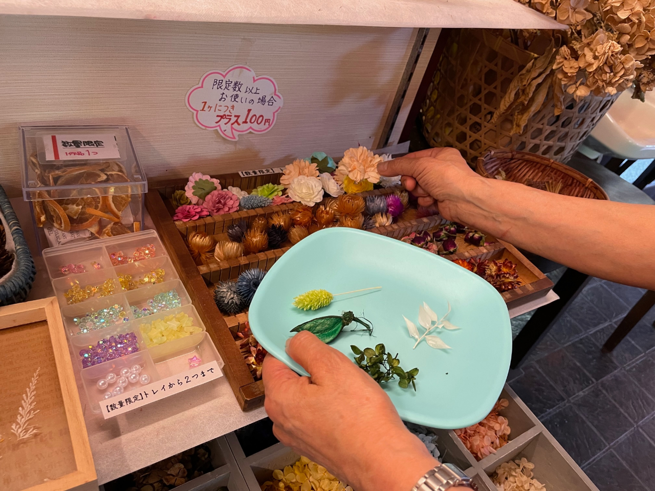 色とりどりのドライフラワー、アーティフィシャルフラワー、木の実、貝殻、和紙など、季節にあった80種類以上の素材から作りたいイメージに合った素材を選びます。