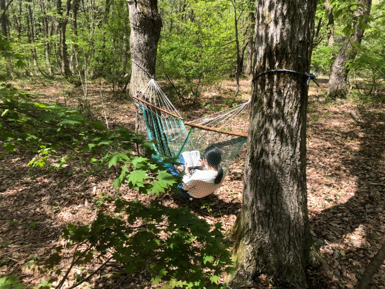 ノンビリハンモックに揺られるのも良し、森の中の野草でお茶を創るのも良し、たき火をしてコーヒーを入れるのも良し、大好きな絵本を読んだり読書したり、もちろん生き物をさがすこともOK。