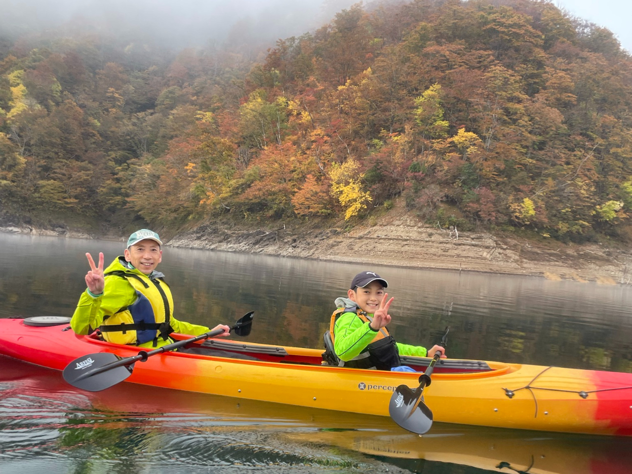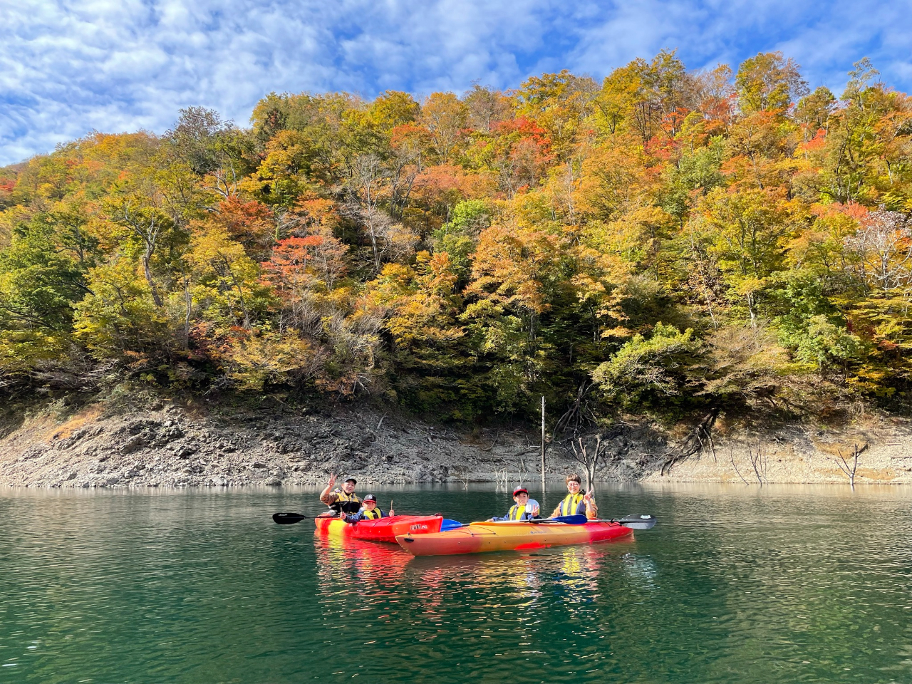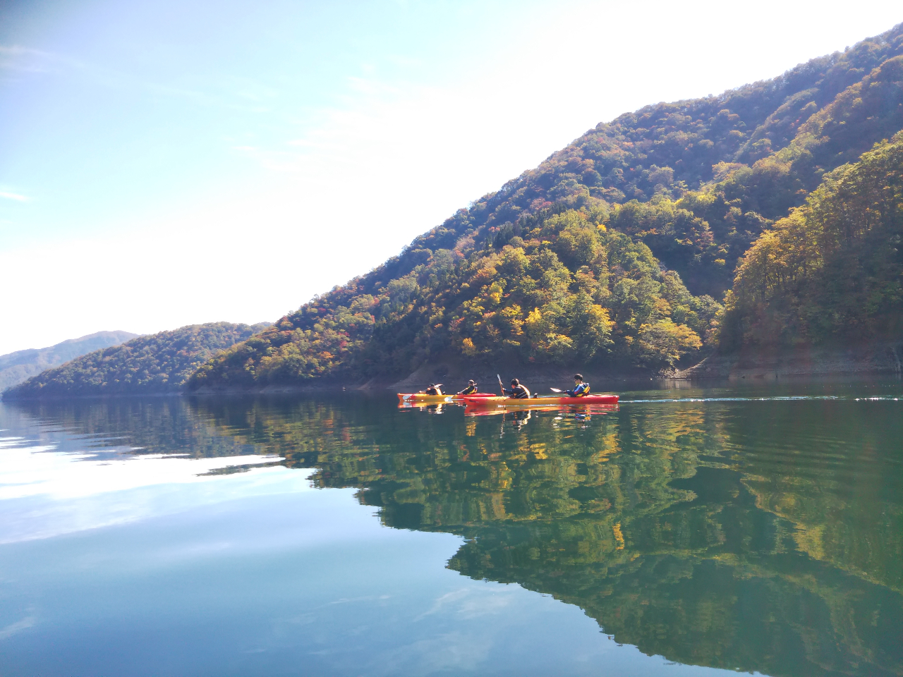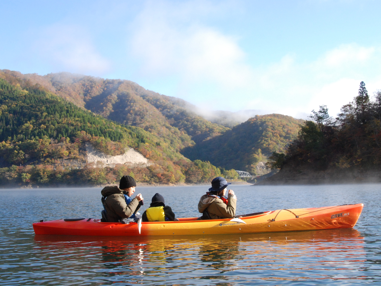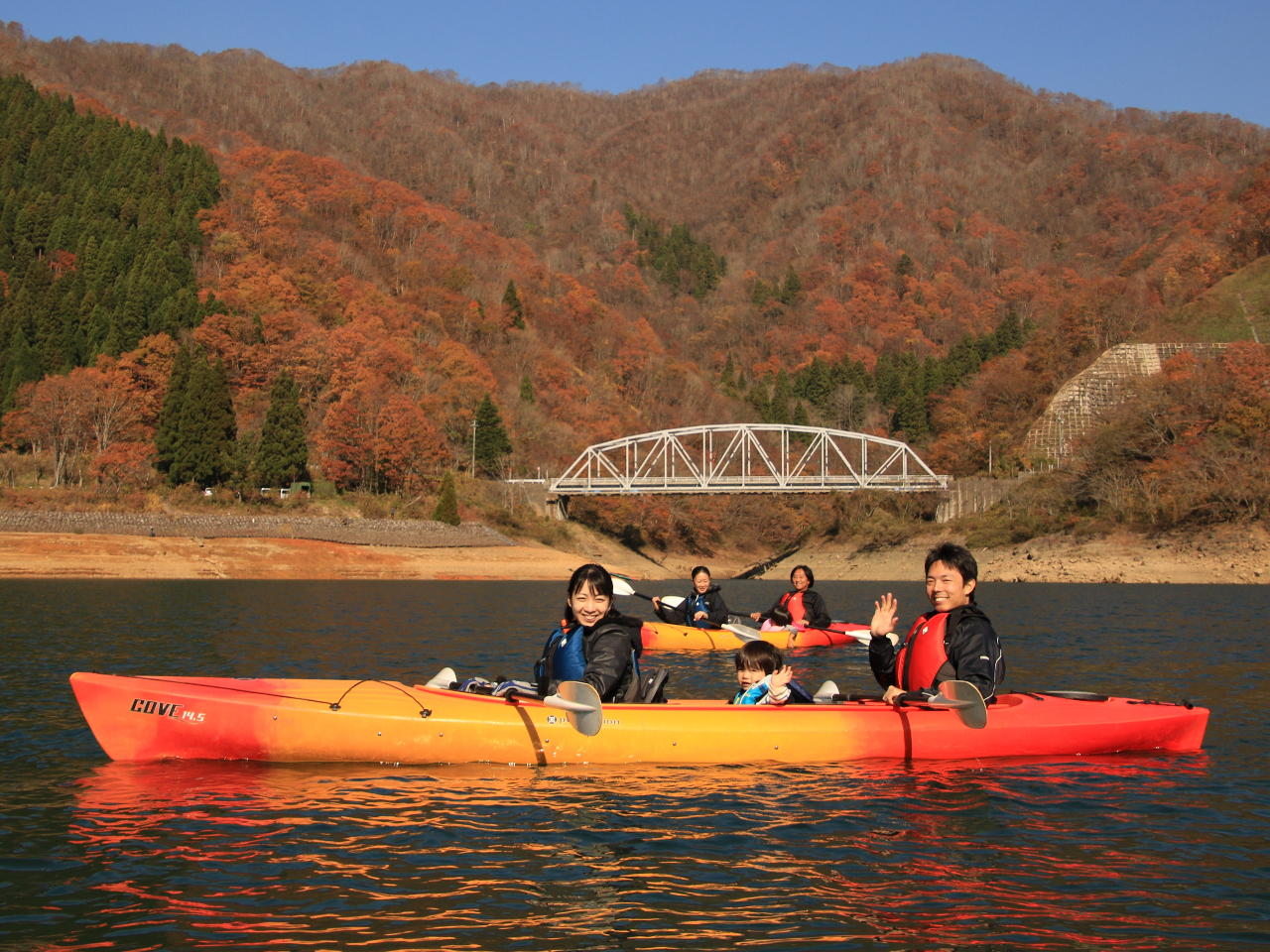 広葉樹の山々に囲まれた、九頭竜湖をカヤックでスイーッと水上散歩。