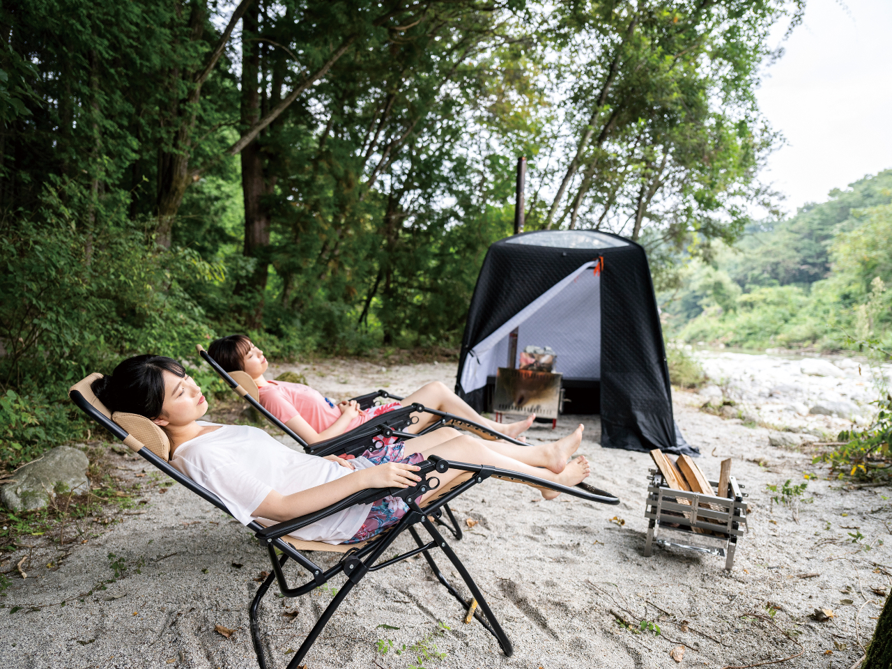 南アルプス連峰を望むロケーションと名水100選の尾白川河畔でのアウトドアサウナをゆったり堪能できます♪