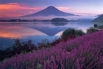 雄大な富士山と河口湖、そして紫色に咲き誇るラベンダーを
