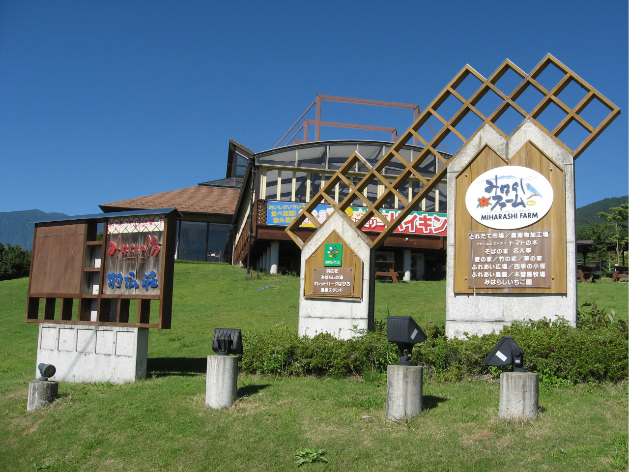 みはらしファーム入り口看板とバイキングレストラン「トマトの木」