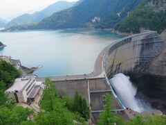 A黒四ダム/電気バスの終点はトンネルの中で、ダムサイトに向かう途中で展望台(220段上り)とダムサイト(60段下り)に分かれる。ダムサイトから放水観覧ステージまでは水平で車椅子でも行ける。ここから階段を下ると新展望広場があり大迫力の放水をさらにまじかに見ることができる。一方、展望台へは放水観覧ステージから280段の急な外階段を登る必要があり、暑い日は涼しいトンネル内から行く方がお勧め。展望台屋上には破砕帯から引いている冷たく美味しい水が出ている。ダムカードはダムサイト出口のレストハウス観光案内所でもらえる。
