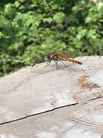 ウッドデッキのポストに止まっていました。