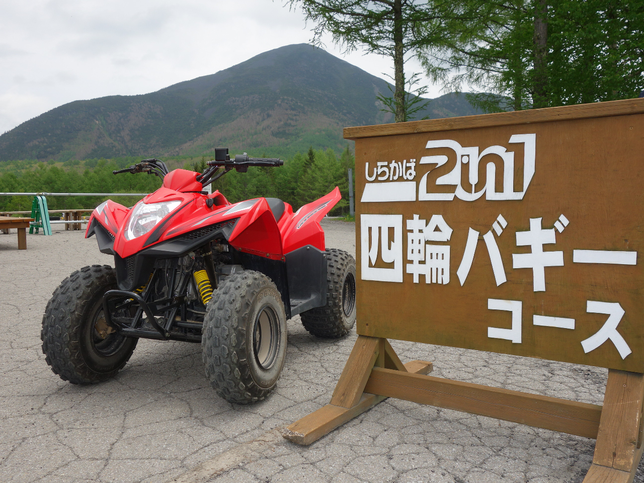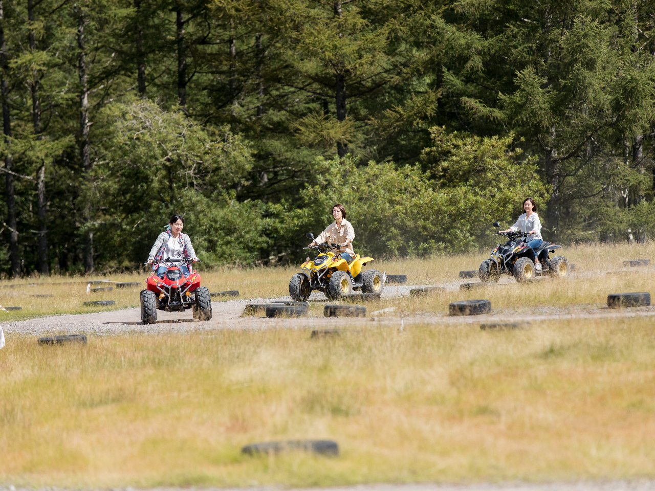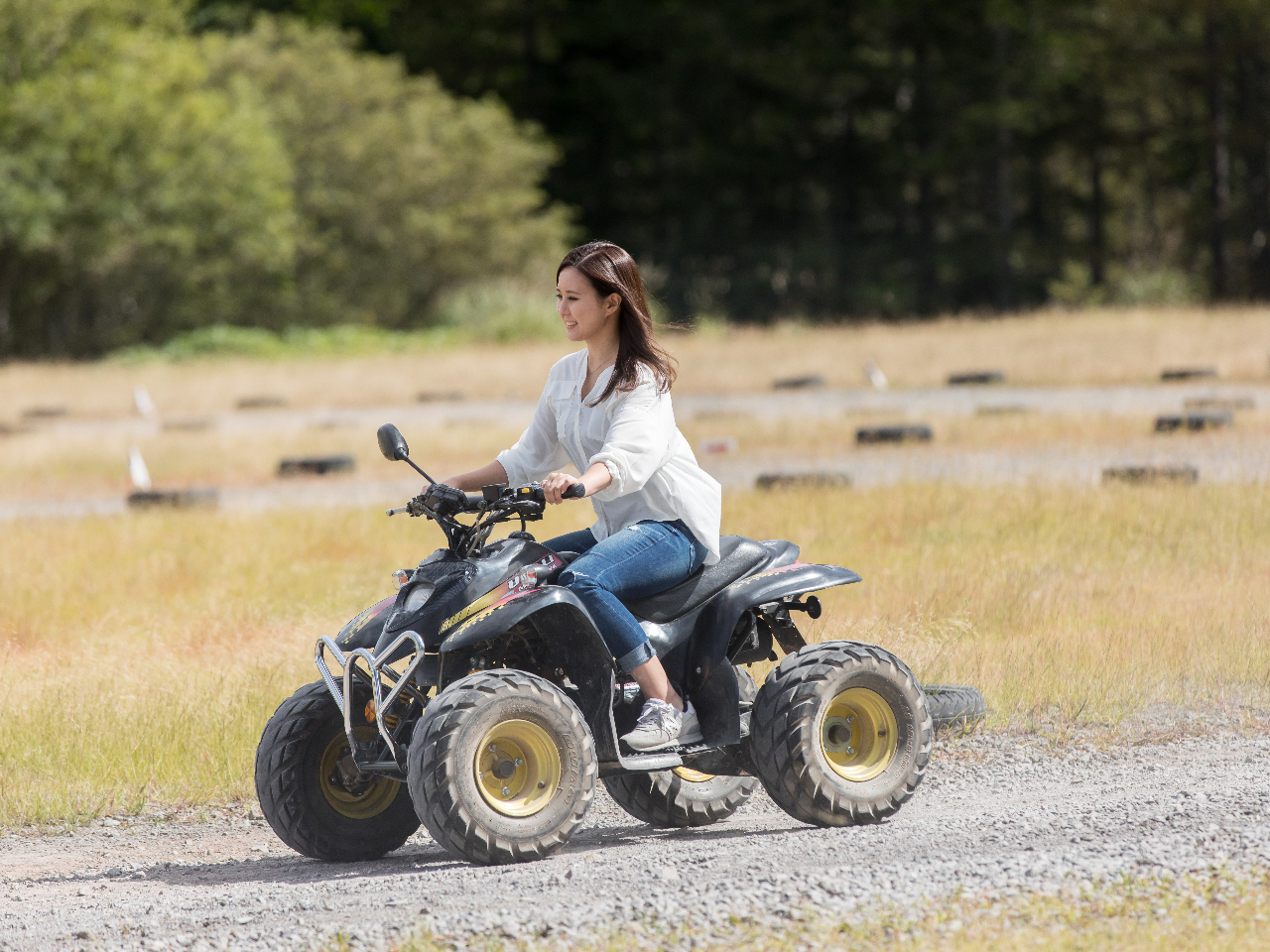 四輪バギー20分間、1台貸切です。親子での2人乗りOKの大変お得なプランです。爽やかな高原で蓼科山を間近に眺め1周約500メートルの変化に富んだコースを満喫して下さい。