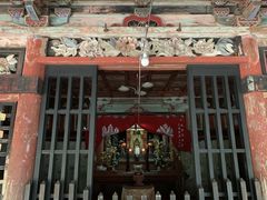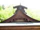 堂の瓦飾りも目を惹きます。屋根を支える天狗の姿があしらわれた、大きくて特徴的な瓦飾りです。