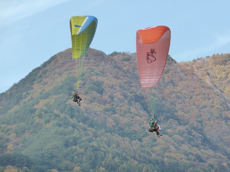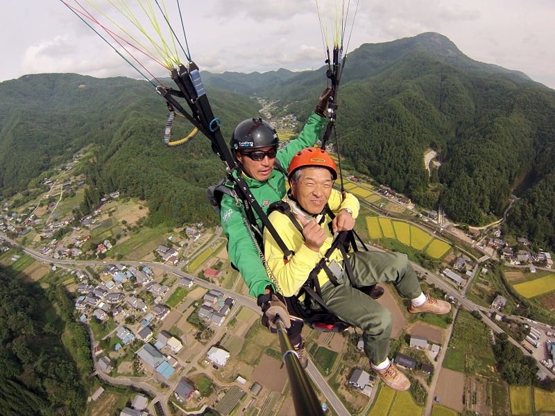 標高1,284mの十観山テイクオフからインストラクターと一緒の2人乗り飛行です。高低差500m、飛行時間は10〜15分。条件が良ければ、北アルプス〜八ヶ岳〜浅間山〜根子岳と360度の大パノラマをご覧頂けます。弊社スクールでは、飛行歴15年以上のベテランインストラクターで、夢のフライトをご案内!!!難しい操縦は、全てお任せ頂き、安心してフライトをお楽しみ下さい。春は桜咲く桃色に田植え後の淡い緑を、夏は真っ白な雲に、突き抜ける青空と山々の萌える緑を、そして秋には紅葉の赤に黄金色の稲穂を・・・信州青木村の豊かな自然を空からお楽しみください。ご自身のカメラや携帯電話、スマートフォンも流れ止めのついたものであれば、空撮もお楽しみ頂けます。是非、チャレンジしてみて下さい。