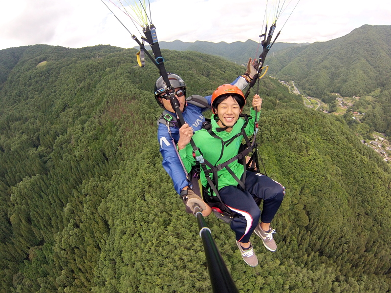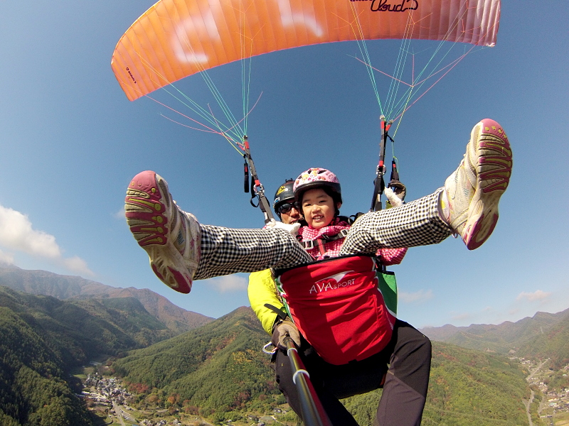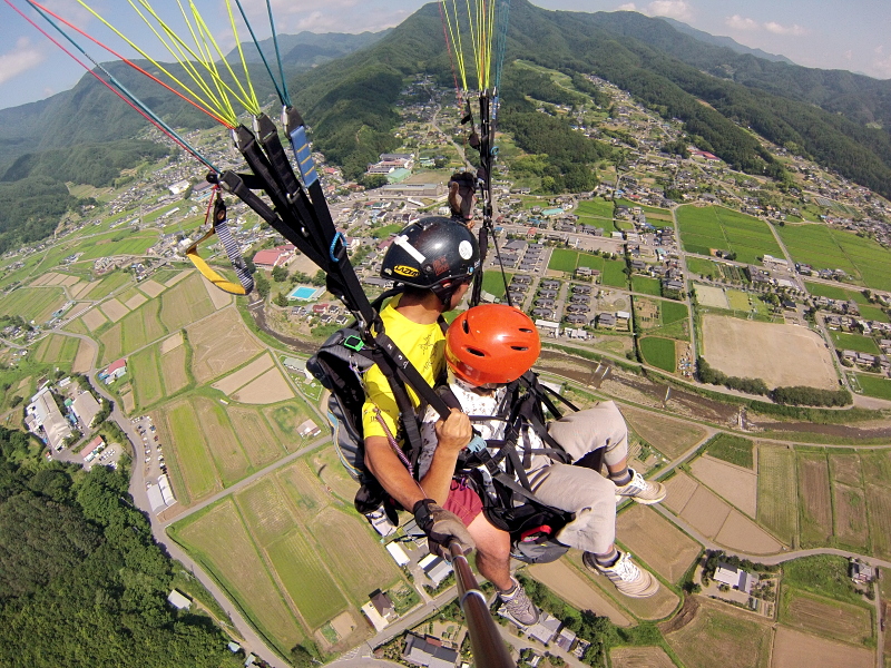 標高1,284mの十観山テイクオフからインストラクターと一緒の2人乗り飛行です。高低差500m、飛行時間は10〜15分。条件が良ければ、北アルプス〜八ヶ岳〜浅間山〜根子岳と360度の大パノラマをご覧頂けます。弊社スクールでは、飛行歴15年以上のベテランインストラクターで、夢のフライトをご案内!!!難しい操縦は、全てお任せ頂き、安心してフライトをお楽しみ下さい。春は桜咲く桃色に田植え後の淡い緑を、夏は真っ白な雲に、突き抜ける青空と山々の萌える緑を、そして秋には紅葉の赤に黄金色の稲穂を・・・信州青木村の豊かな自然を空からお楽しみください。ご自身のカメラや携帯電話、スマートフォンも流れ止めのついたものであれば、空撮もお楽しみ頂けます。是非、チャレンジしてみて下さい。