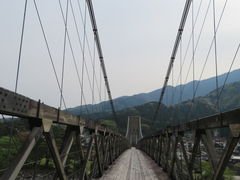 妻籠宿からバスで移動してきて、南木曽駅にきました。電車がくるまで時間があったので、木曽川に向かって歩きました。桃介橋は大正時代に木曽川に水力発電所建設の物資運搬のために造られた木造の吊り橋です。三つの主塔があります。橋には昔、トロッコが走っていたあ面影があります。橋の中央の主塔からは河原に降りられる石段がある面白い橋でした。