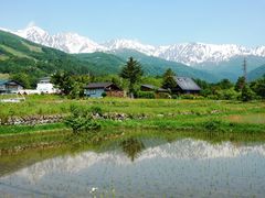 白馬山麓の白馬村北城付近からは雪渓の残る白馬連峰がきれいに見えます。田植えが終わり水の張られた田んぼの「水鏡」は最高です。