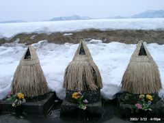 お地蔵さんは目の前ののどかな水田に苗植えがされ稲刈りがされるさまを1年中暖かい眼差しでみています。それが終わるとほどなく雪が降り目の前の水田が真っ白なさまに変わっていきます。