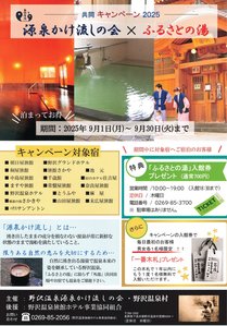 9月1日から9月30日の間、源泉かけ流しの会加盟宿にご宿泊いただいた方へ、特別に「ふるさとの湯」入浴券(通常700円)をプレゼントいたします。