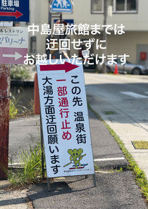 温泉街や村内道路に画像の迂回看板(車向け)が多数設置されていますが