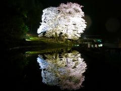 苗代桜のライトアップで水田に映り込む姿は凛として美しい。