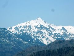 中央より少し右よりにある、ちょこんと出っぱった山が、笠ヶ岳だったと思います。新穂高ロープウェイに乗ると、可愛い娘さんが山々の案内をしてくれて、急いで写真を撮りました。参考までに→「新穂高ロープウェイ」の公式ホームページに、何分か前までの展望台のライブカメラが見られます。