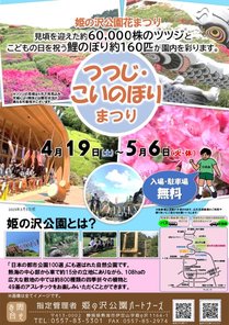 姫の沢公園には約6万本のツツジの咲く「ツツジ園」があり、毎年多くの方がツツジを見にご来園されます。今年もツツジの開花に併せて「つつじ・こいのぼりまつり」を開催いたします!