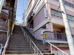 熱海駅から路線バス乗って国道135号線にある「伊豆山中央」バス停で降りて、そのバス停から100mほど戻ったところにある押しボタン式信号機から見える階段が伊豆山神社の参道でした。その信号機から参道の階段を30段ほど下った階段途中の左側に走り湯浜浴場がある。