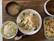 今日のまかないは海老レタスチャーハン。
