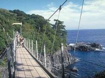 - 海岸線には絶壁が連なり、幾重にもふところ深く入り組んだ岩礁、岬から岬へと続く眺めはまさに壮観です。門脇崎の海の吊り橋は長さ48m、高さ23mでスリル満点です。