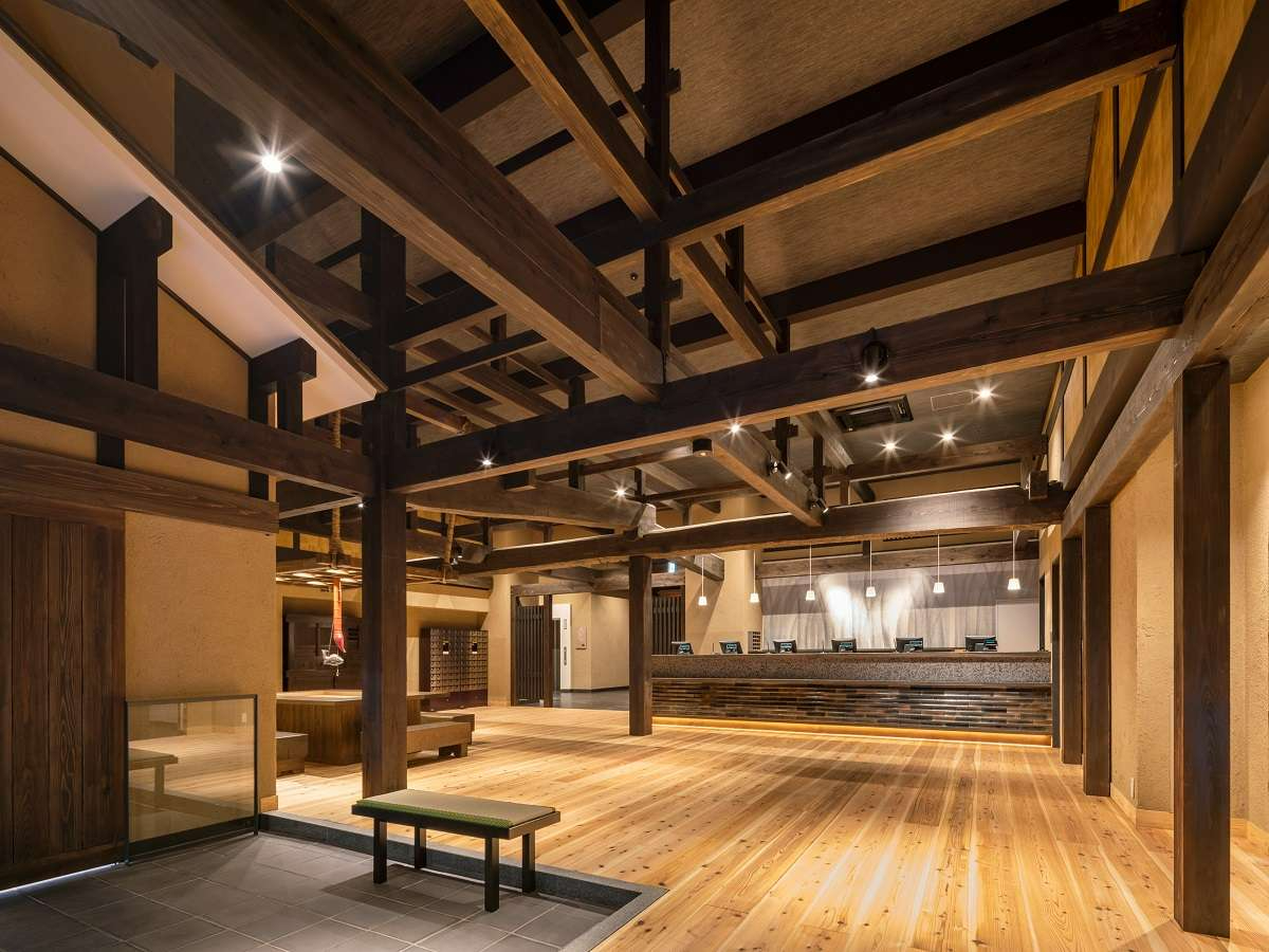 【フロント・帳場】木の花の湯へようこそ。エントランスを抜けると、趣きあるデザインの帳場で笑顔のスタッフが皆さまをお出迎えいたします。