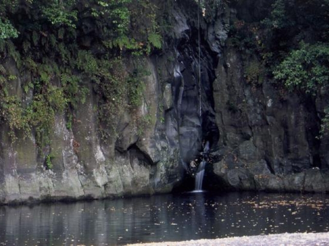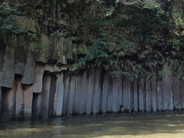 景ヶ島渓谷の末端にできた見事な柱状節理。溶岩の中心部が時間をかけて冷却しながら収縮し、垂直に割れ目が入ったもので、六角形の柱が何百本と谷壁を作っている。高さ10m幅70mの範囲で露出している。