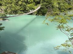 緑に垣間見える湖面のエメラルドグリーンと吊り橋のコントラストは美しいです。