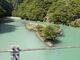 さっそく渡ってみると、これは予想以上に揺れる! ちょっと怖い! というか油断するとスマホが落ちるぞこれ! 恐らくほとんどの人はスマホで写真を撮ると思うが、必ずストラップは持っていきましょう。とはいえ、橋下の風景は色鮮やかで、山の深緑、空の紺碧との調和がとても美しく、まさに絶景。怖いけど渡る価値は十二分にある。