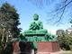 地下鉄本山駅から程近い広い境内の桃巌寺、全身鮮やかな緑色の名古屋大仏様が現れます。その台座が特徴的で、一般的には蓮台座ですが何と10頭の像が支えていました。