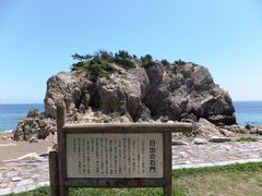 椰子の実の記念碑を通り過ぎて、浜辺まで階段を下りきると目の前に登場します。恋路ヶ浜から見ると風穴がある岩礁が見えますが、ここではありません。日出の石門は浜辺と地続きになっています。でも、どちらも石門と呼ばれているようです。