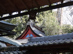 本殿です。朱色の綺麗な本殿で、千木も立派です。『春日社記』には、767年に「伊賀國名張郡一瀬河にて御沐浴、鞭を持って験として立てたまふ木に成つく」と記載されている。