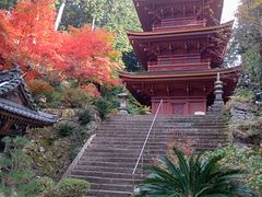 階段を登り切った時に朱塗りの三重塔が見えます。