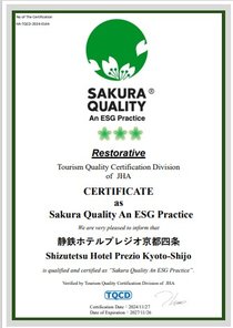 静鉄ホテルプレジオ京都四条は宿泊施設向けESG認証制度「Sakura Quality An ESG Practice」(通称:サクラクオリティグリーン)において、3御衣黄ザクラの認証を取得いたしました。