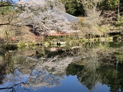 桜の季節、色々な桜が咲いています。池があり建物と桜が反射して綺麗。境内は少々荒れていますが、言い換えれば自然のままの感じで苔むしています。