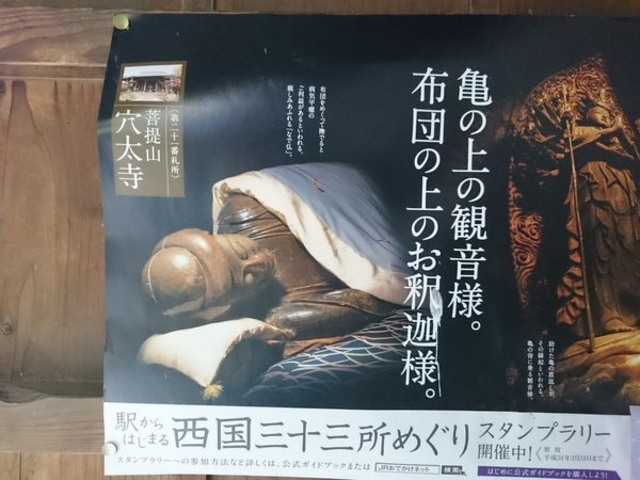 穴太寺となで仏と称される、釈迦如来涅槃像が有名で、涅槃像の、自分の病があるところと同じ部分をなでると病が良くなると伝えられています。大勢の人々がなでるので、仏さまは黒光りなさっています。仏さまに掛けられている布団は病が癒えた人々が奉納したものだそうです。お寺でいただいたパンフレットによりますと、この仏さまは明治29年(1896年)に本堂の屋根裏からお出ましになったそうです。当時、孫娘の病平癒ために日々参詣していた信者の霊夢によって、この像が探し出されたと紹介してありました。