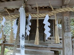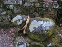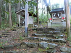 本殿横から神社を出ようとすると「天満宮」がある祭神は菅原道真で、牛も祀られているのだが、ここは自然石か自然石を加工したものを2つ社殿両脇に置いている。