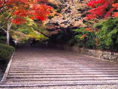 大阪からサイクリングを兼ねて自転車でやってきました。紅葉のピークよりは少し早かったですが、それでも見事な景色!紅葉はもちろん、紅葉が映える総門や、幅12mはありそうな壮大な石階段・女人坂は画になるロケーション!紅葉が石段に舞い降りてさぞやキレイなんだろうと思います。紅葉狩りの後は近くに"小倉山荘 竹生の郷"があるので、温かいお茶と甘いお菓子をどうぞ!