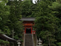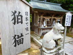 急な石段の先に立派な丹塗りの神門が聳えています。神門を潜り、しばらく石段を辿ると稲荷社への道を分けます。右手が本殿へ向かう道です。そちらを少し上った左手に狛猫で有名な木島神社(きしまじんじゃ)があります。本殿に向かって左側は、子猫の頭に前足を載せ、口を開いた阿形の猫、右側は口をぐっと閉じた吽形の猫です。阿形の猫には天保3年、吽形の猫には弘化3年に相当する銘が台座に刻まれています。