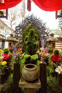 「法善寺」にある西向不動明王は「水掛不動尊」の名で親しまれており、不動尊は願いを込める人たちがかけた水によって生えた緑の苔で全身がびっしりと覆われています。
