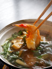 具足鍋 西洋伊勢海老と蛤 芹と白占地に九条葱と水菜