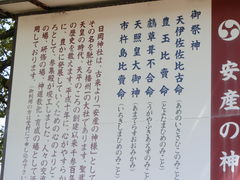 天平時代創祀の古社で珍しい神様を祀る。第十二代景行天皇の皇后・稲日大郎姫命(いなびのおおいらつめ)が最初のお産が難産だったので、次に身籠られた時に、主祭神・天伊佐佐比古命が安産を願い、無事双子の皇子を安産されたそうな。双子の皇子の一人がヤマトタケルである。