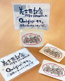 そして、吉では義士祭開催記念として、いつもお世話になっている彩結び書のますもとにこさんに可愛いOnigishi47を描いて頂きました。ステッカーになっていますので、旅の記念にお持ち帰りいただけると幸せです。