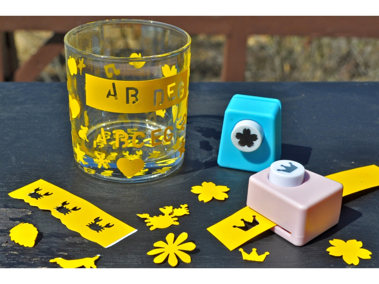 クラフトパンチで様々な柄のシールを作りコップに貼ってブラスト加工が楽しめます!