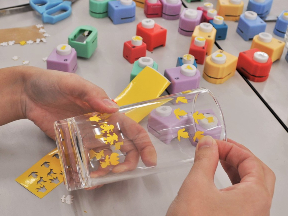 いろいろな形のパンチでシールをくりぬき、選んだガラスのコップに貼り付けて作品を作りました。