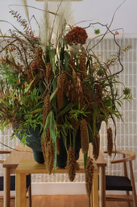 そこに、ヒオウギの実やツルウメモドの枝が自然の生命力を映し出し、エリンジウムとクルクマが奥行きのある彩りを添えてくれます。