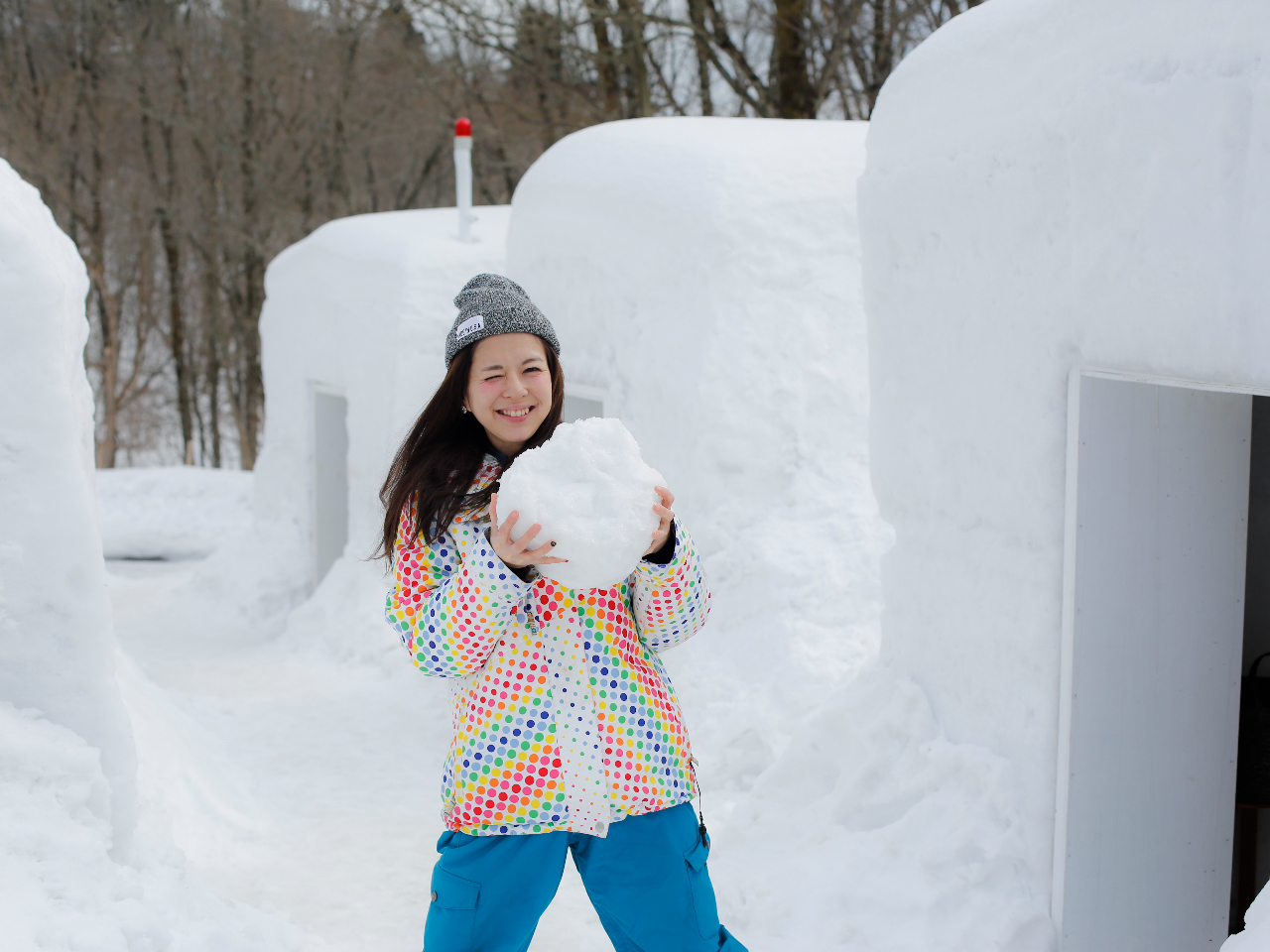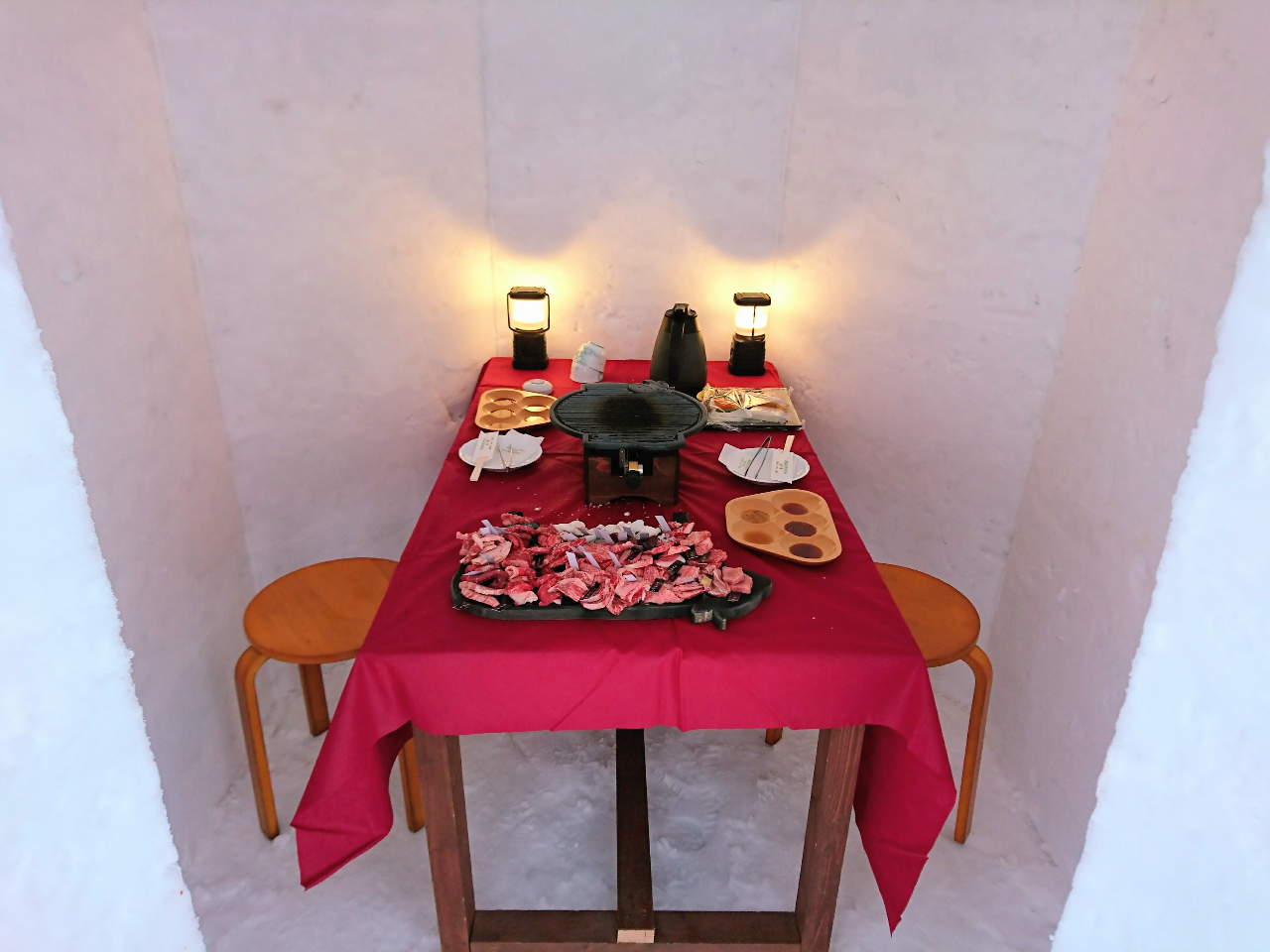 煙の出にくい専用のコンロを使用しかまくらの中でバーベキュー。
